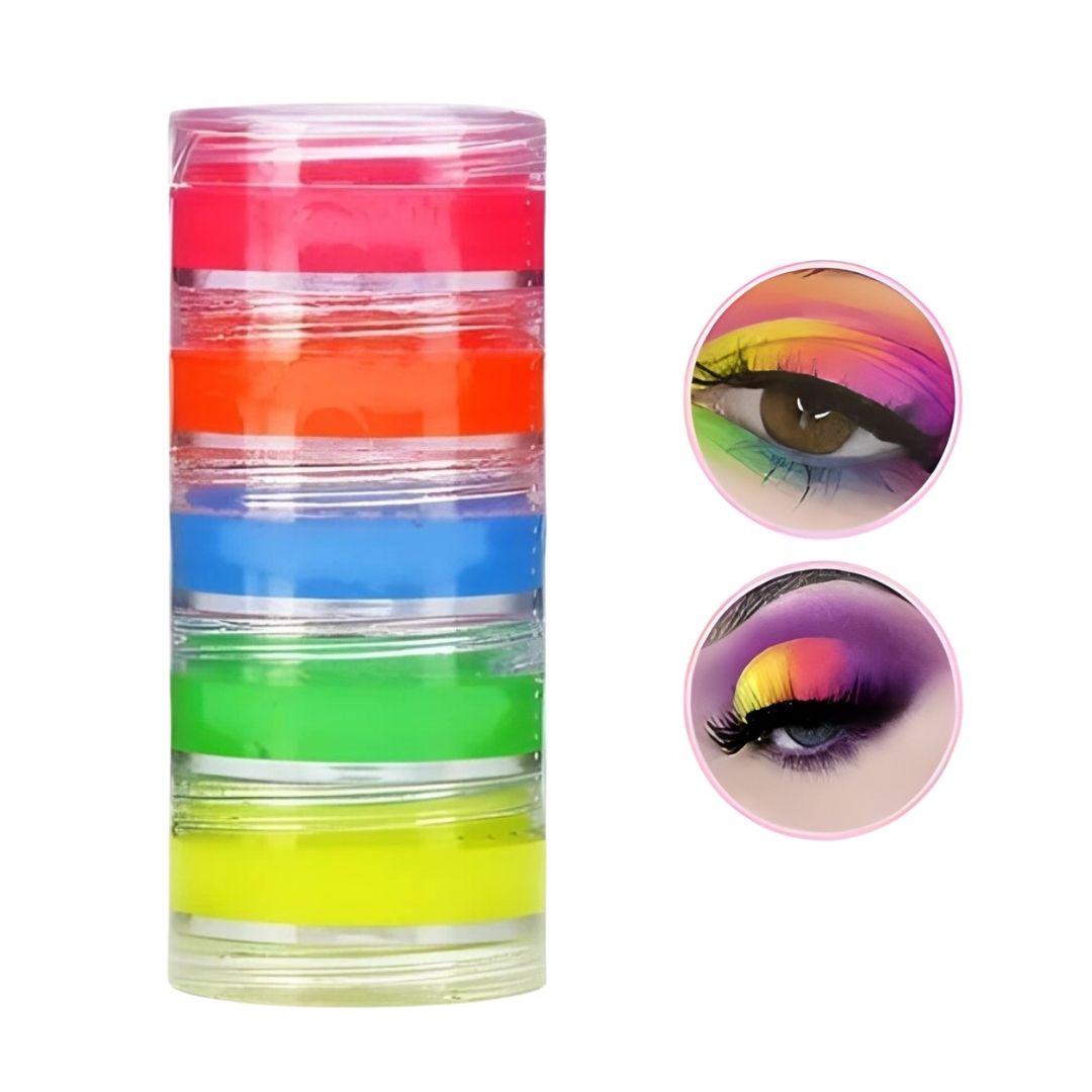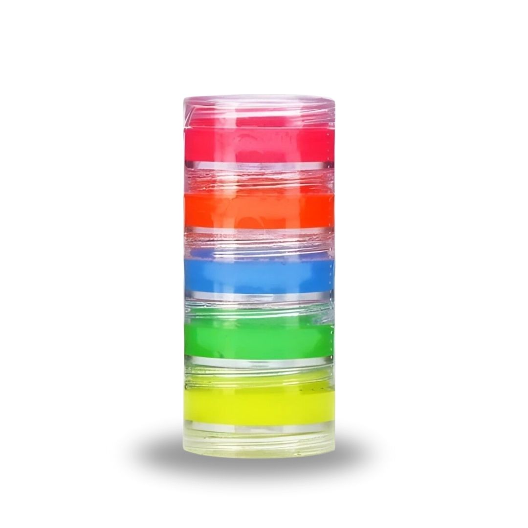 Torre de tinta colorido com 5 opções de cores, sendo tinta cremosa, e própria para rosto, com 4g de tinta em cada potinho